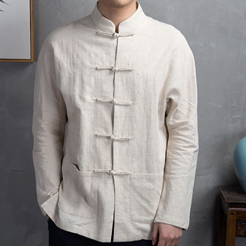 Buddha Stones Solid Color Casual Frog-button Men's Shirt Clothing