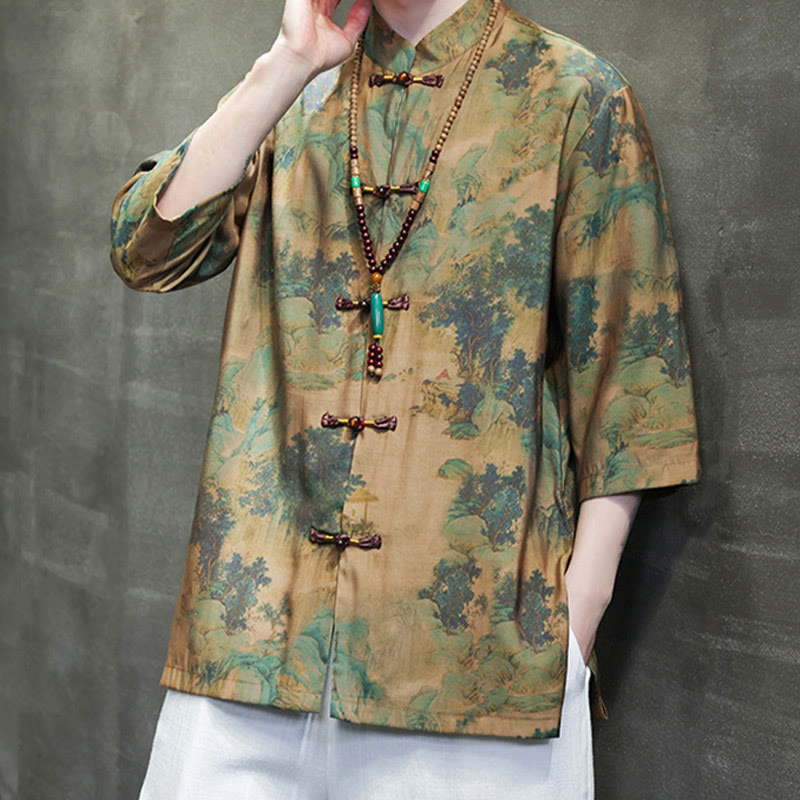 Buddha Stones Landscape Chinese Dragon Pattern Chinese Three Quarter Sleeve Shirt Men T-shirt