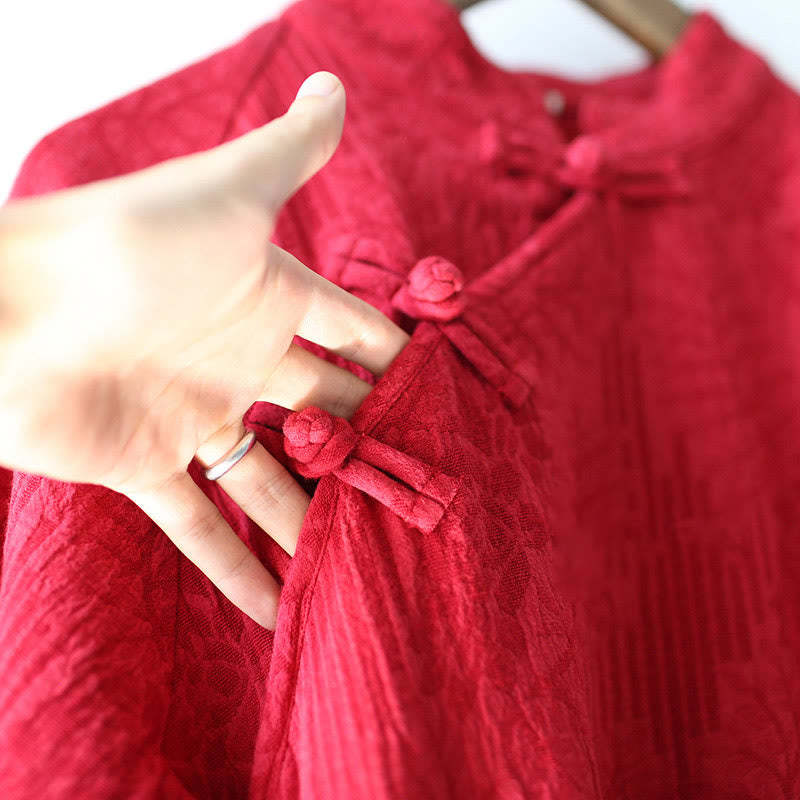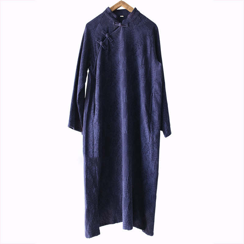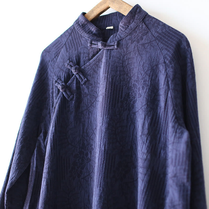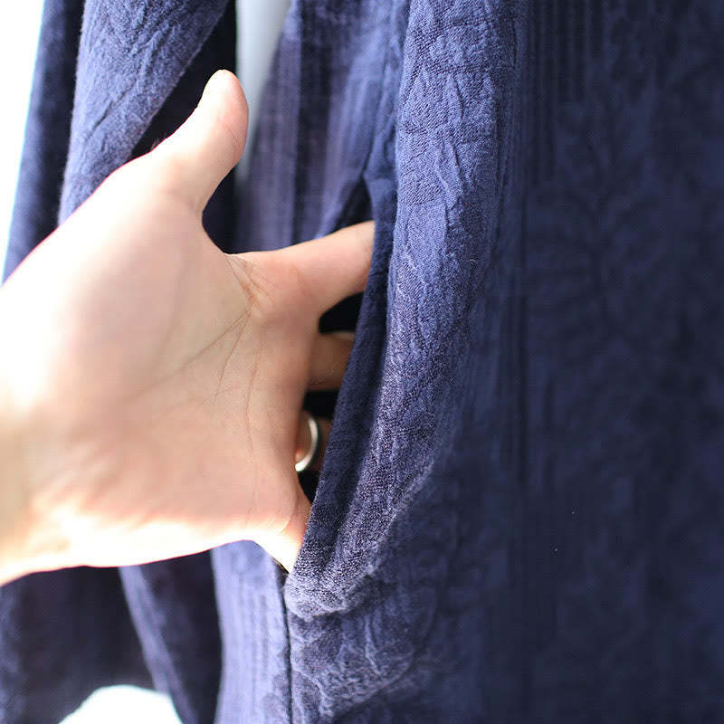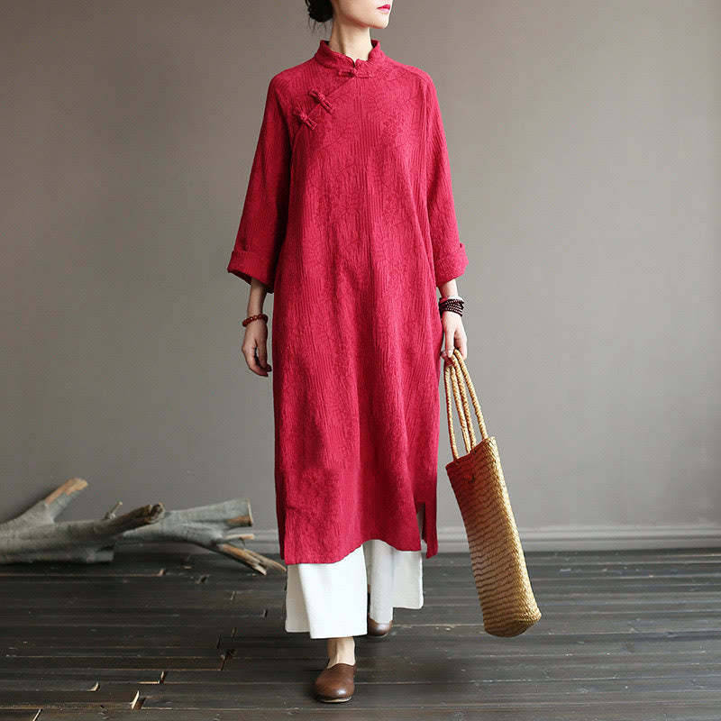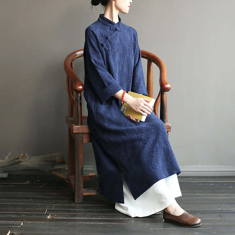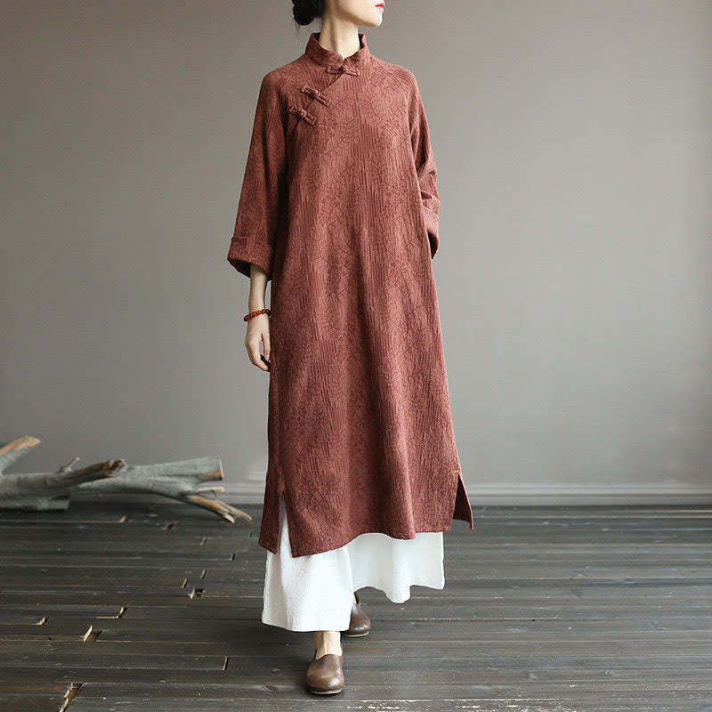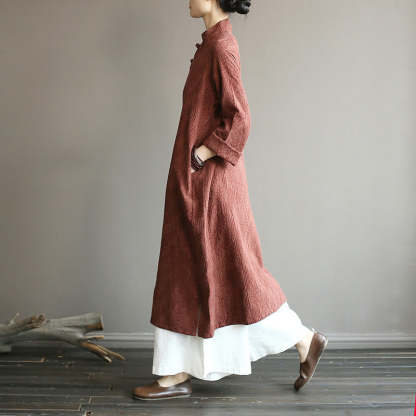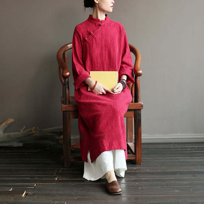 Buddha Stones Flower Jacquard Midi Dress Long Sleeve Cotton Linen Dress Wide Leg Pants With Pockets