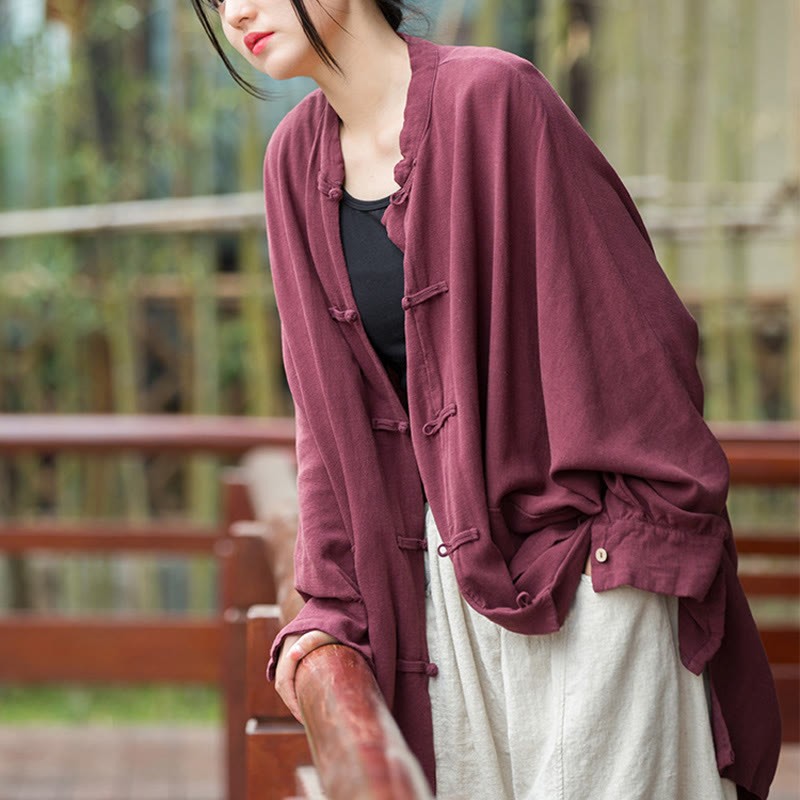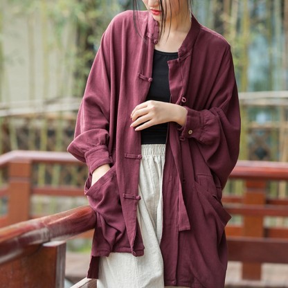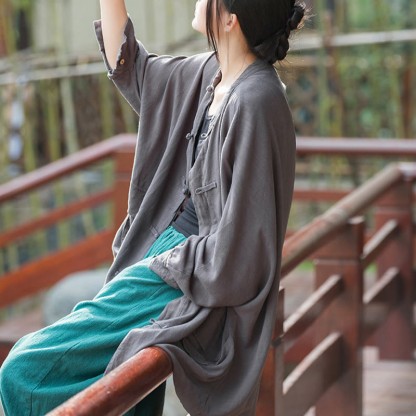Buddha Stones Frog-Button Long Sleeve Zen Meditation Open Front Jacket With Pockets
