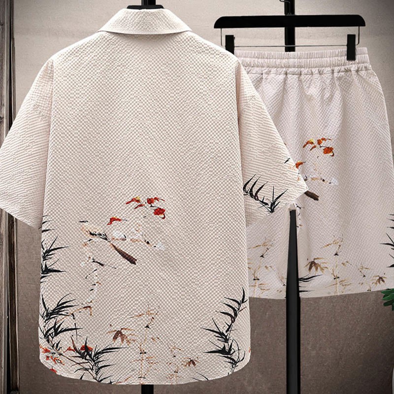 Landscape Coconut Trees set features a vibrant magpie pattern, short sleeves, and matching shorts. This men's set, inspired by nature, showcases intricate landscape and coconut tree designs. Made from lightweight, breathable fabric, it ensures comfort and style. Perfect for those who appreciate a blend of nature-inspired motifs and casual comfort.💕