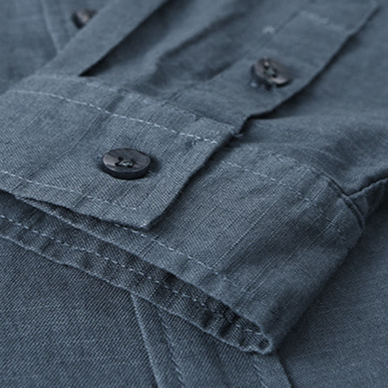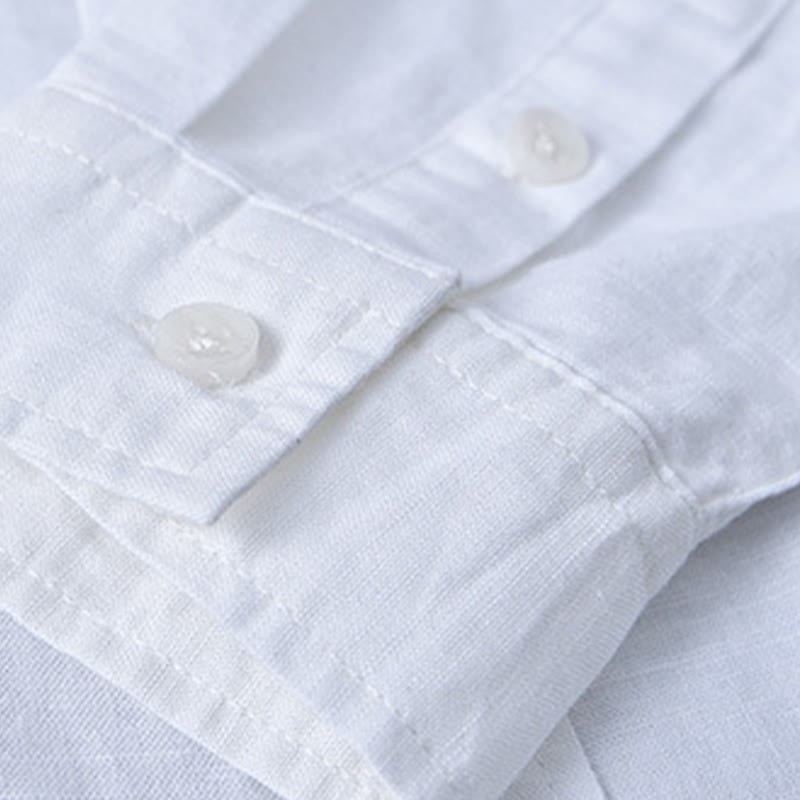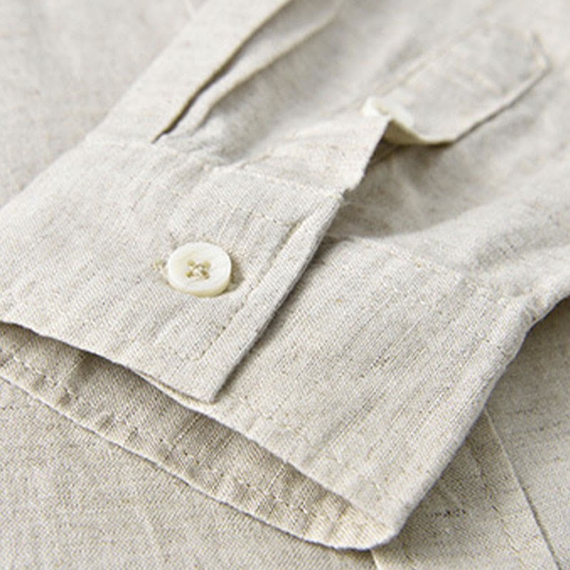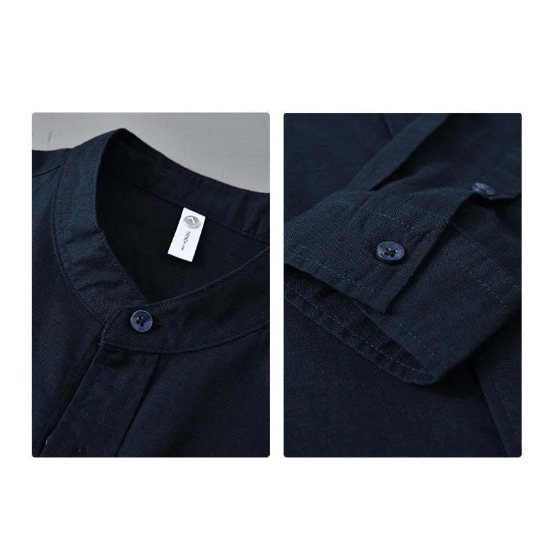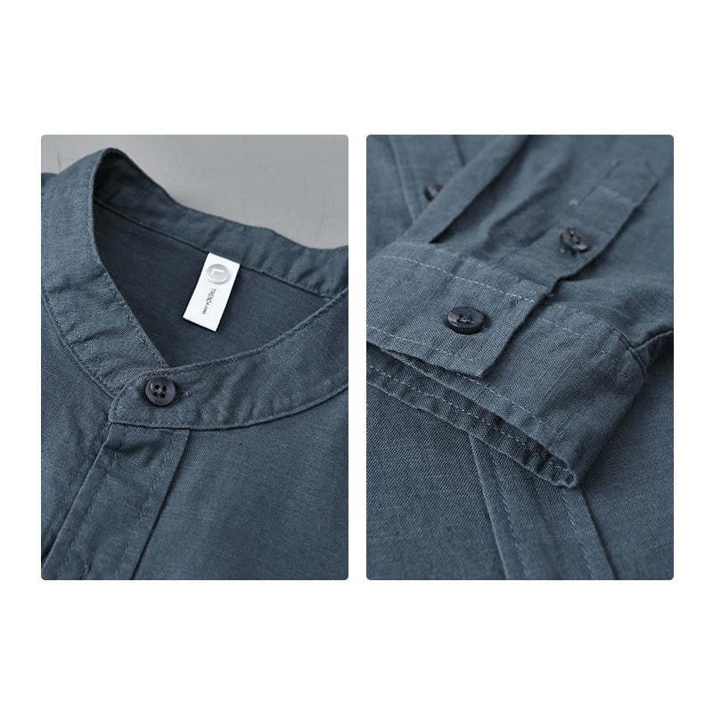 Buddha Stones Men's Long Sleeve Stand Collar With Pocket Pure Color Casual Cotton Linen Shirt
