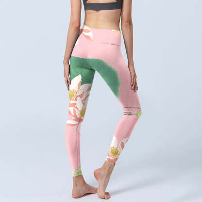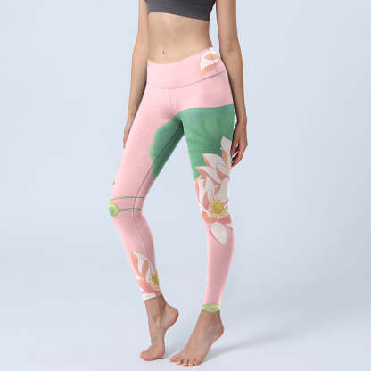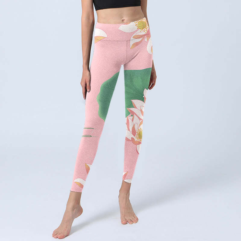 Buddha Stones Pink Lotus Flower Leaf Print Gym Fitness Leggings Women's Yoga Pants
