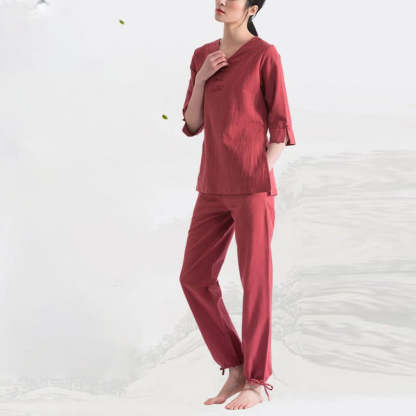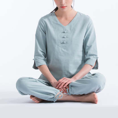 Immerse yourself in spiritual tranquility with Buddha Stones' Zen Practice Women's Set. Crafted from breathable cotton-linen, this uniform harmonizes body and spirit. Embody serenity and invite mindfulness into your practice. Our attire deepens your connection to nature, amplifying your spiritual experience. Elevate your journey towards inner peace, enveloped in the essence of serenity.
