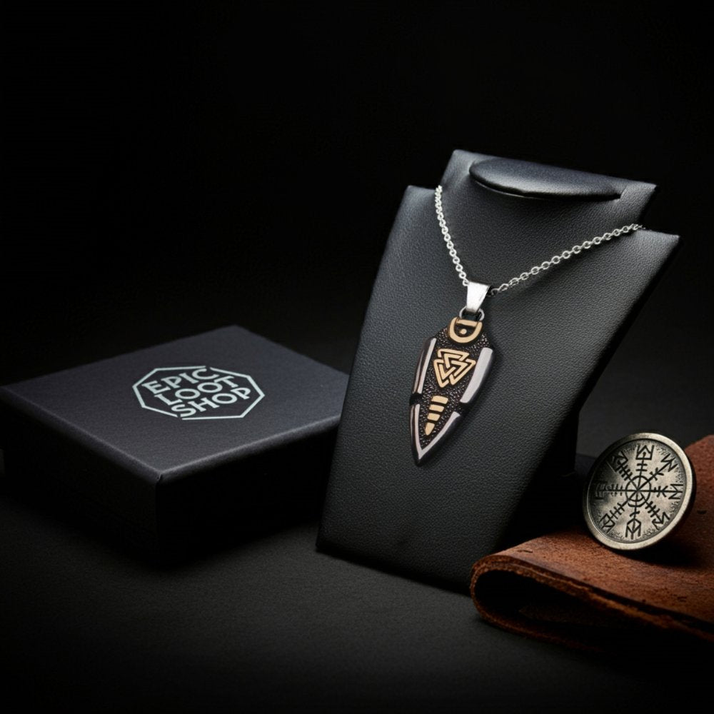 From the ancient sagas of the Norse gods comes a pendant imbued with the power of Odin’s spear, the Valknut symbol, and the Helm of Awe. This Viking necklace serves as a potent talisman, designed to protect, strengthen, and guide the wearer on their path. Meticulously crafted, this piece of Viking jewelry embodies the wisdom and might of Odin, making it a perfect accessory for those who seek to channel their inner warrior and embrace their ambitions.