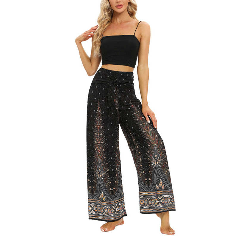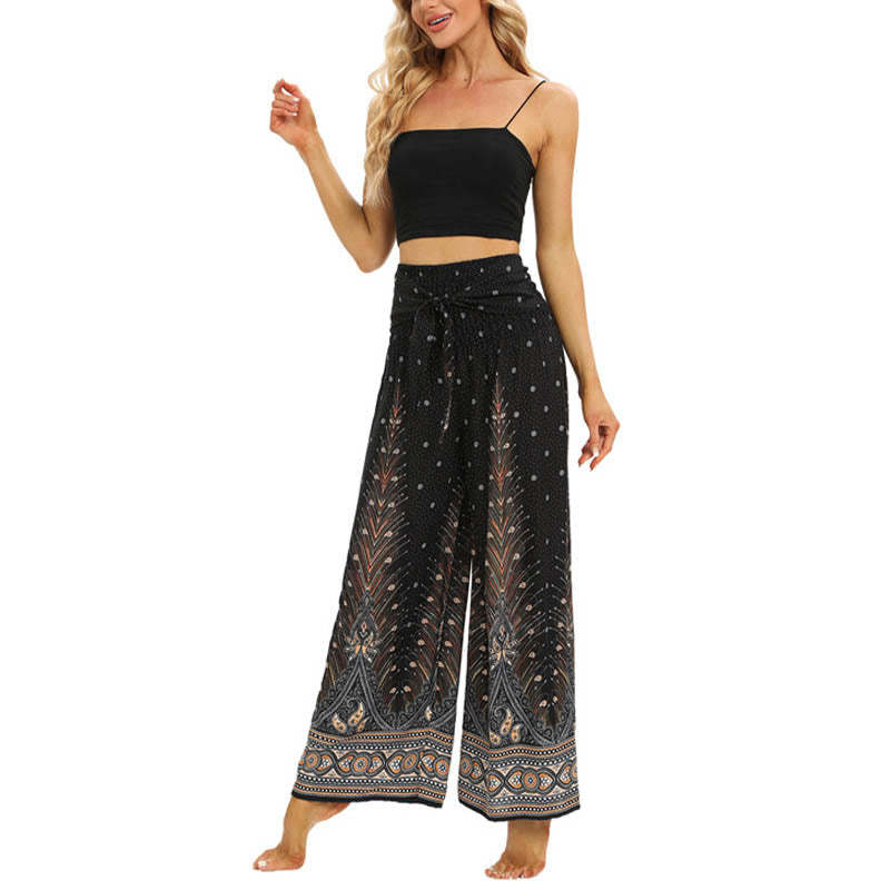 Buddha Stones Boho Peacock Feathers Lace-up Wide Leg Pants Women's Yoga Pants