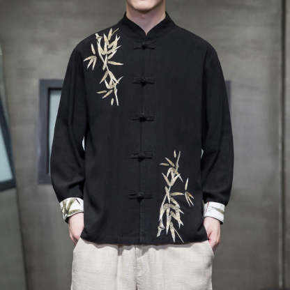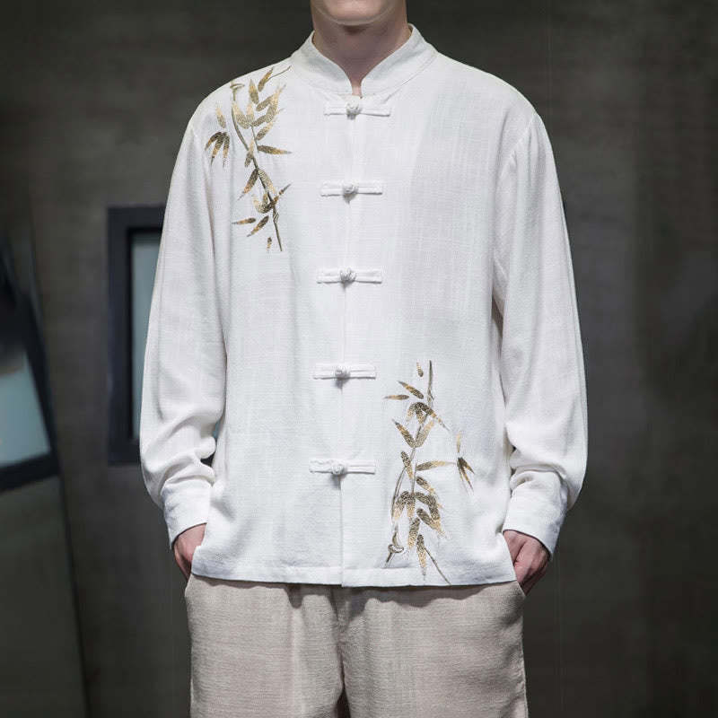 Buddha Stones Chinese Frog-Button Tang Suit Bamboo Leaves Long Sleeve Shirt Cotton Linen Men's Jacket