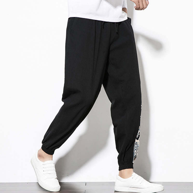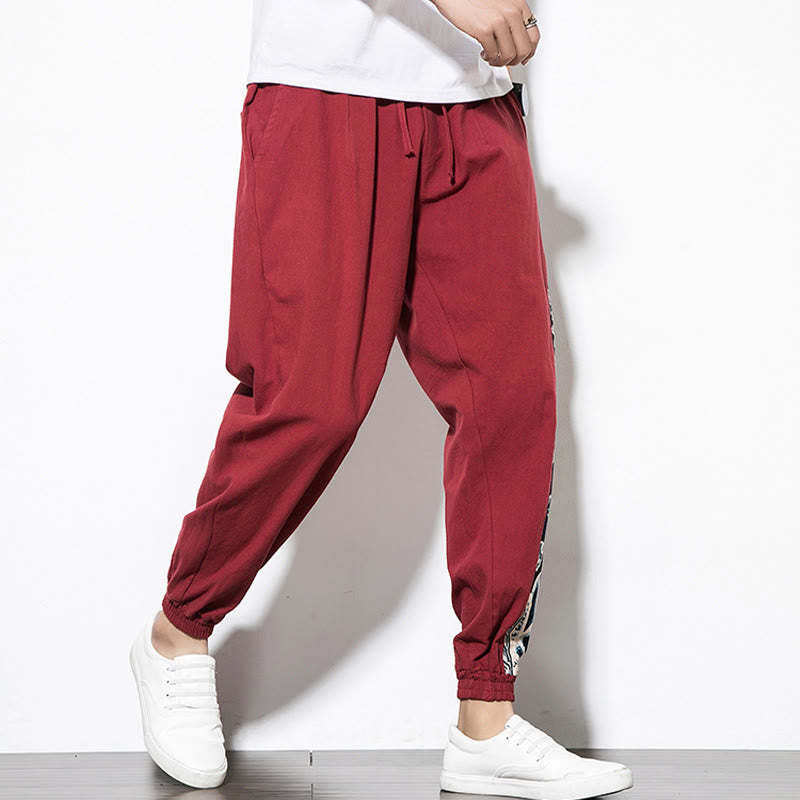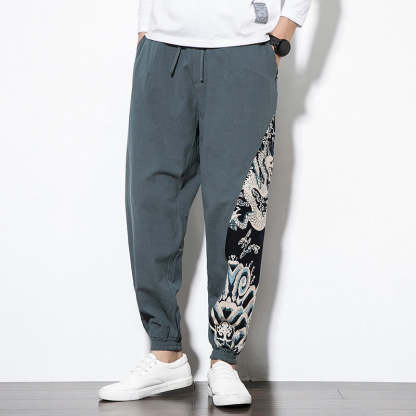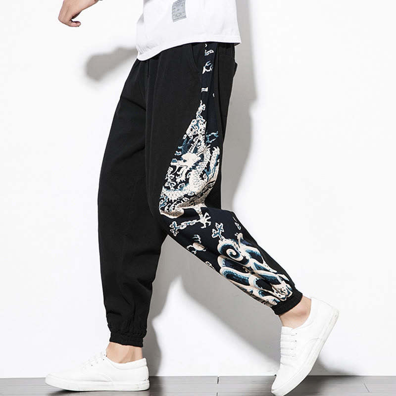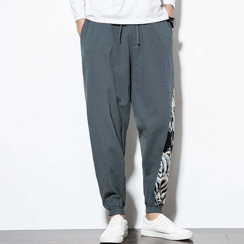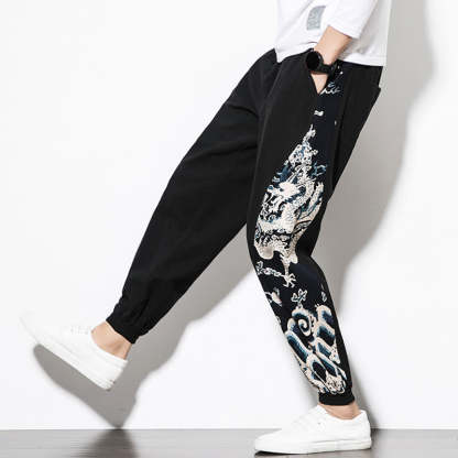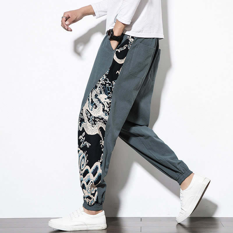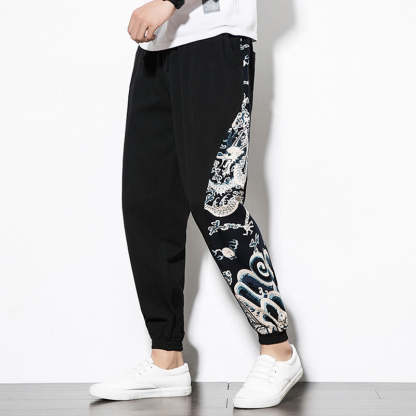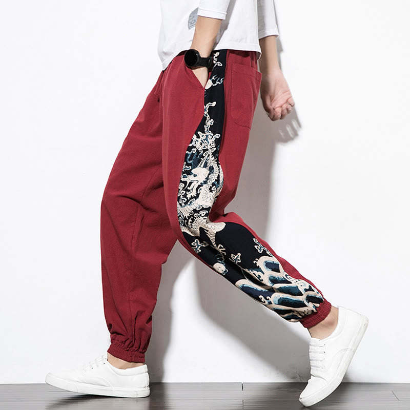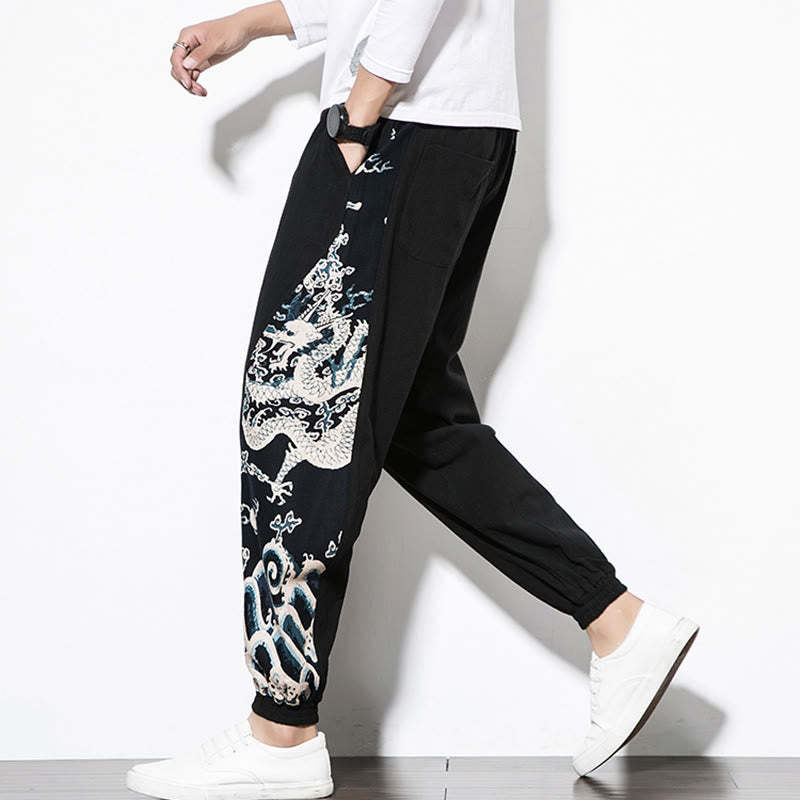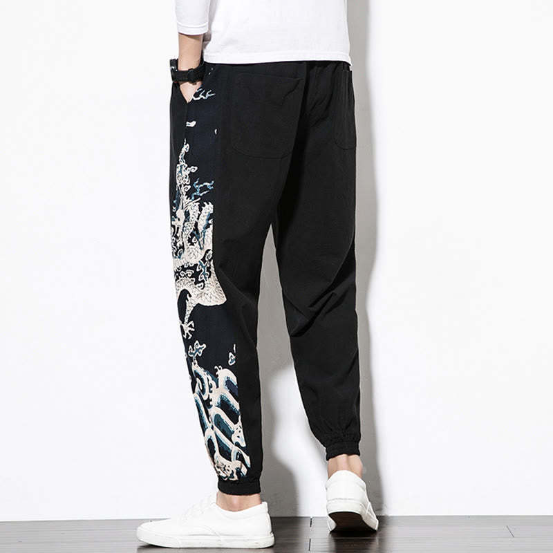 Buddha Stones Summer Dragon Waves Cotton Men's Pants With Pockets
