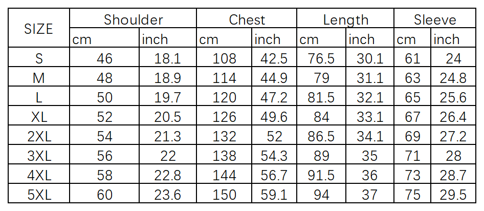 Men's Long-Sleeve Shirt Size Chart (All measurements in inches)