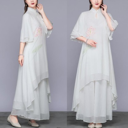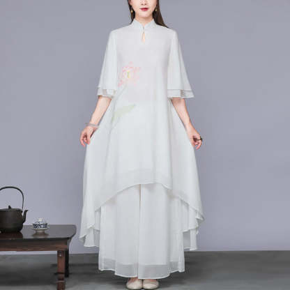 Buddha Stones 2Pcs Lotus Flower Cheongsam Midi Dress Wide Leg Pants Chiffon Zen Women's Set