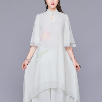 Lotus Cheongsam Midi Dress and Wide Leg Pants chiffon set combines elegance with comfort, designed for zen and peaceful activities. The cheongsam midi dress features a beautiful lotus flower design, while the wide-leg pants provide a graceful and flowing silhouette. This women's set is perfect for those seeking a harmonious blend of traditional style and serenity.💕
