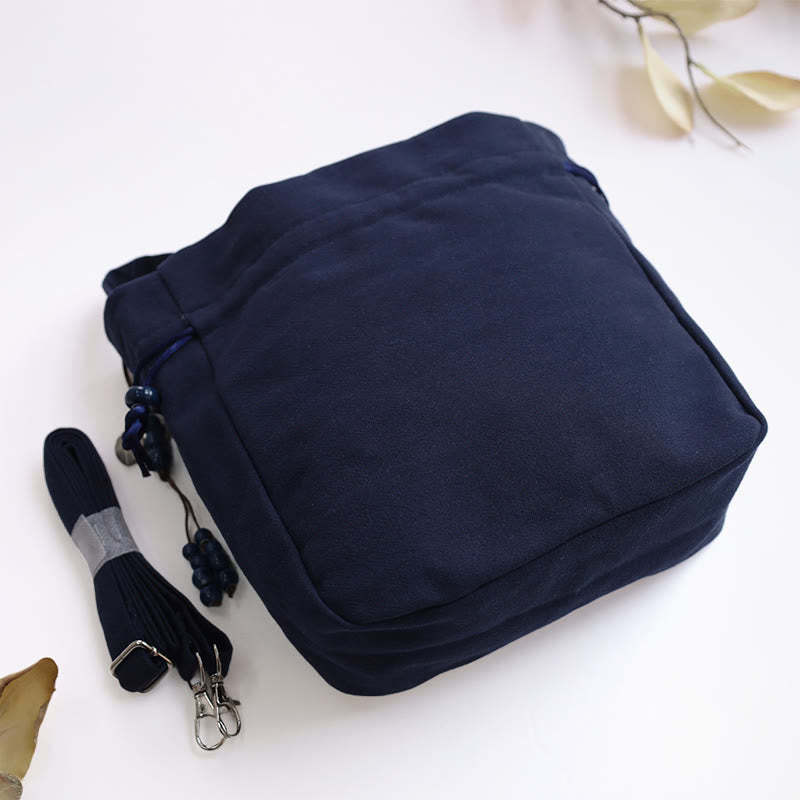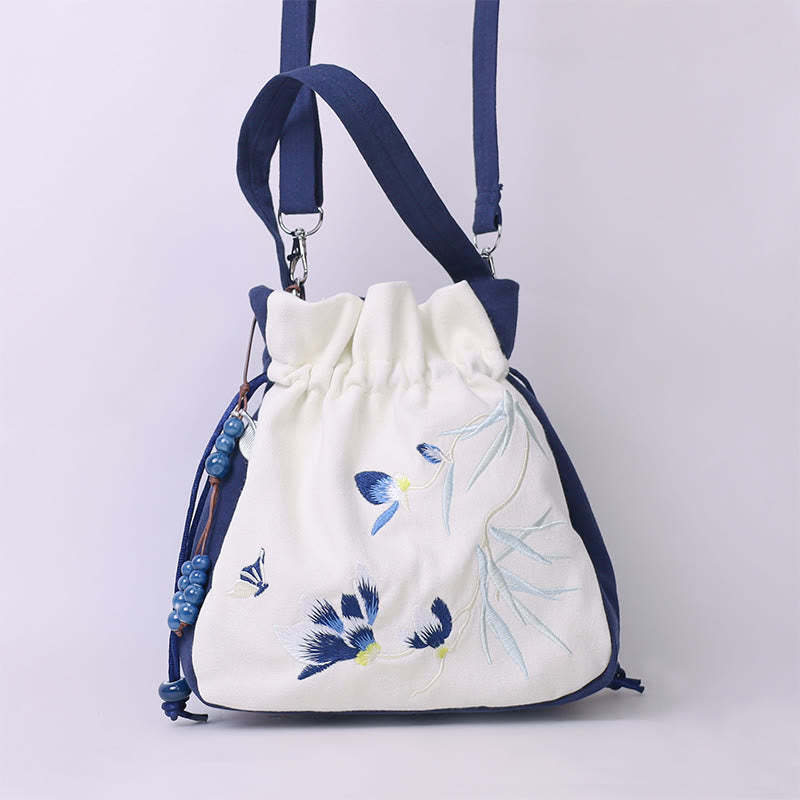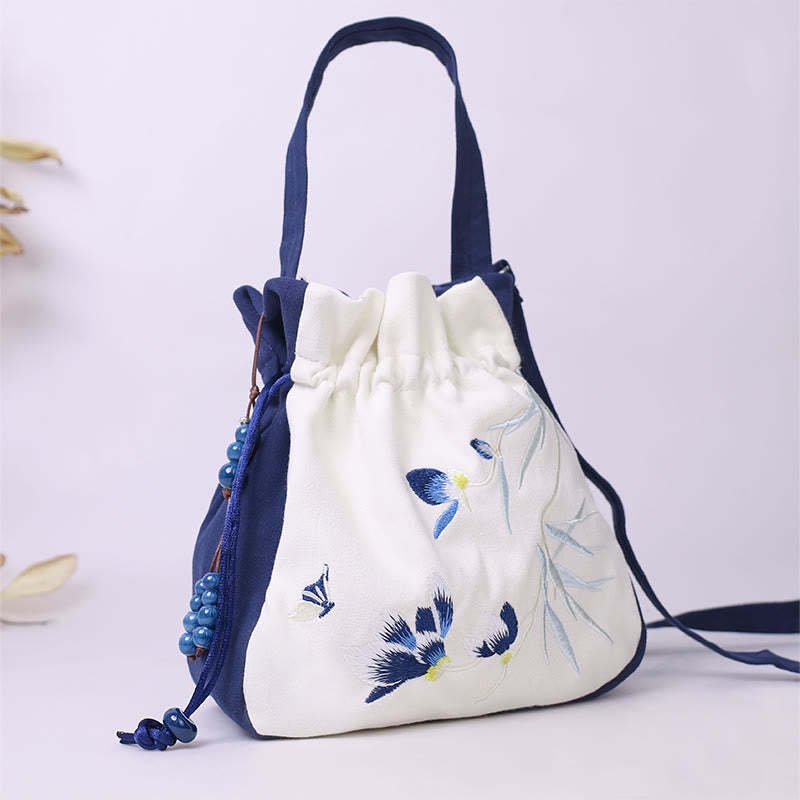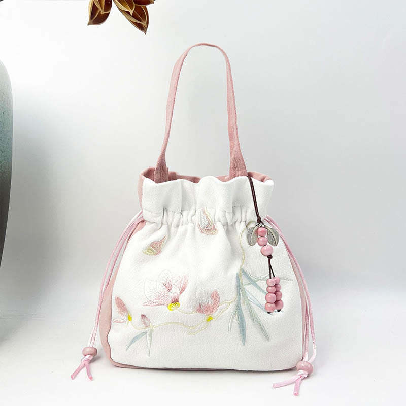 Buddha Stones Embroidered Butterfly Lotus Magnolia Cotton Linen Tote Crossbody Bag Shoulder Bag Handbag