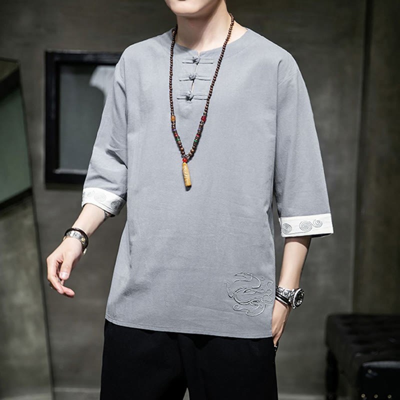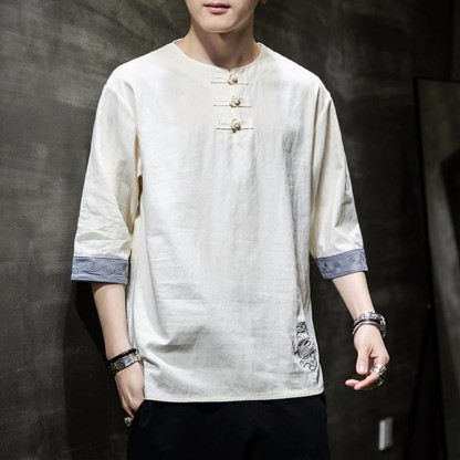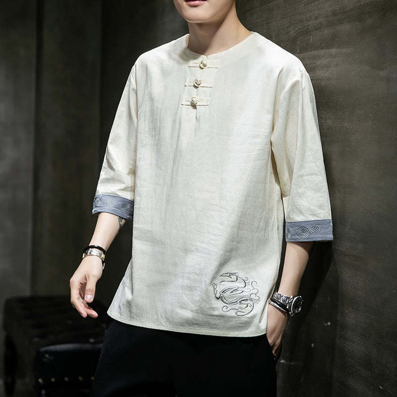 Frog-Button Dragon Embroidery shirt combines traditional Chinese design with modern comfort. This three-quarter sleeve shirt features intricate dragon embroidery, symbolizing strength and power. Crafted from breathable cotton linen, it ensures comfort and style. The unique frog-button closure adds a touch of cultural authenticity.💕