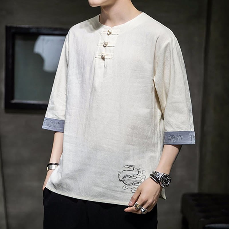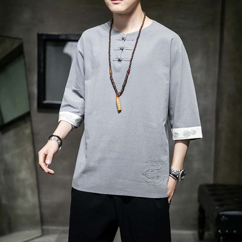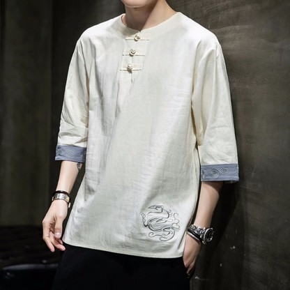 Buddha Stones Frog-Button Dragon Embroidery Chinese Tang Suit Three Quarter Sleeve Shirt Cotton Linen Men Clothing