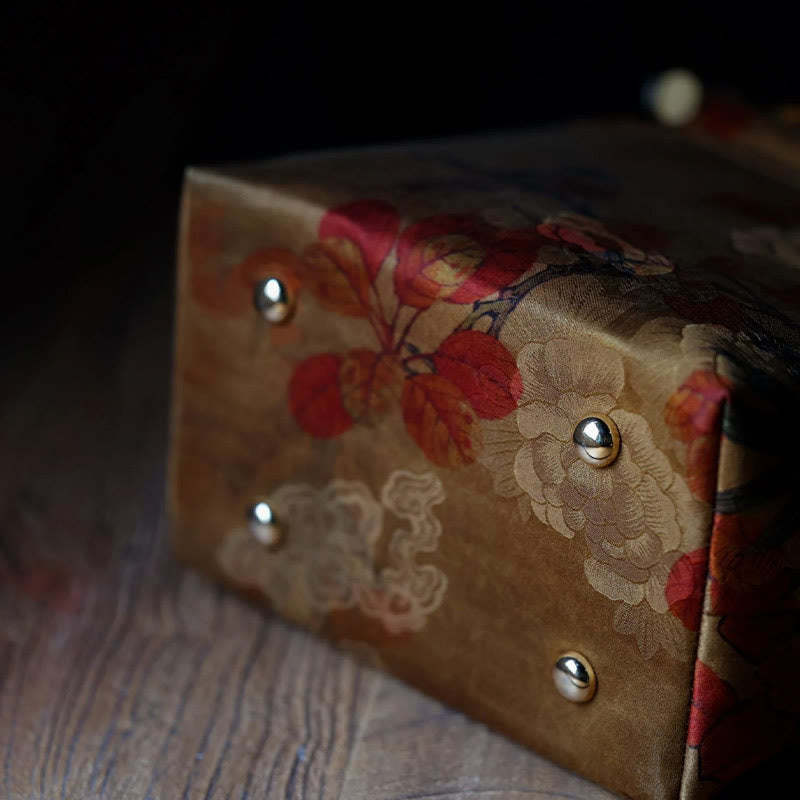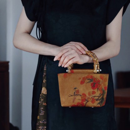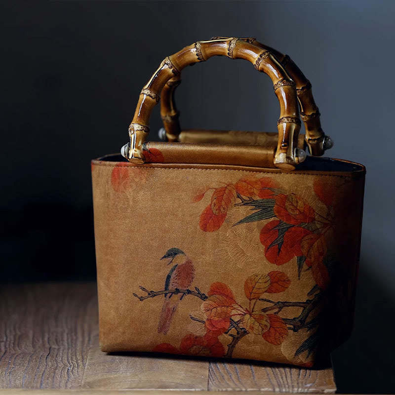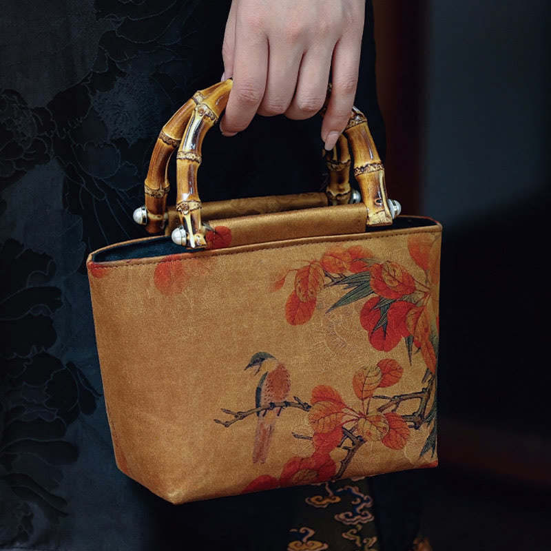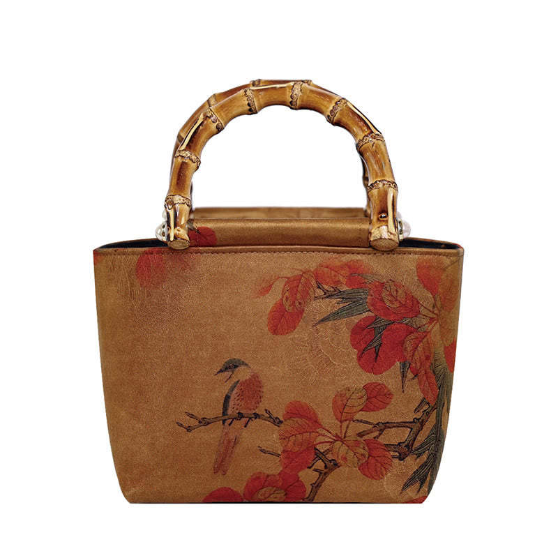 Yellow Bird Branches Green Peony Flower handbag features a charming design of yellow birds on branches and green peonies with elegant bamboo handles. This stylish handbag combines natural beauty with practical design, making it perfect for both daily use and special occasions. The vibrant colors and unique elements add a touch of nature-inspired elegance to your attire.💕
